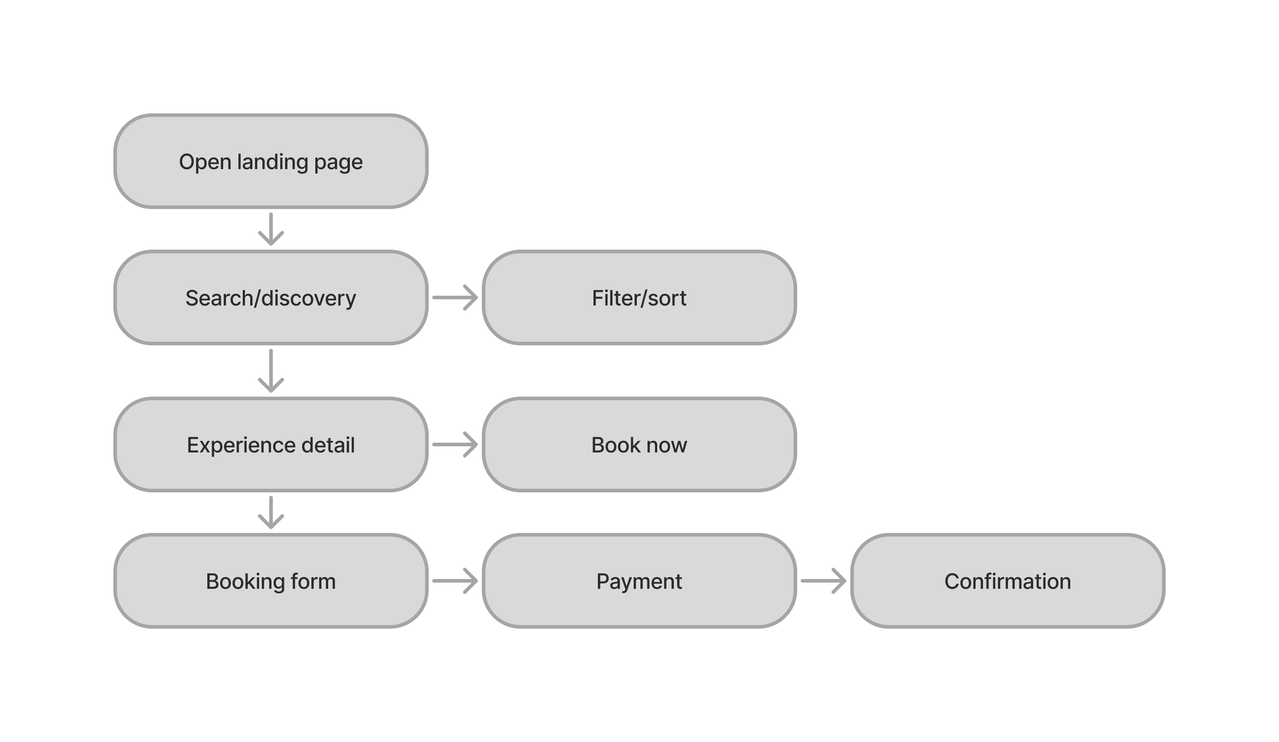 The core journey includes browsing experiences, reviewing details, selecting options, and completing a booking.