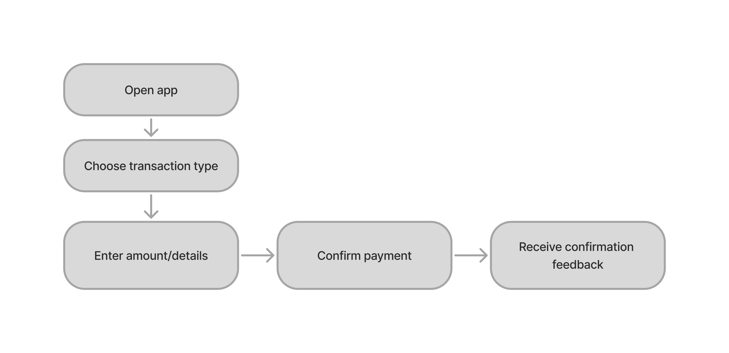 The core flow guides users from selecting a payment action to completing a transaction with clear feedback at every step.